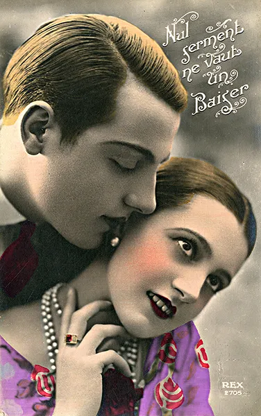 Carte postale romantique vers 1930. Tirage argentique d’époque colorisé