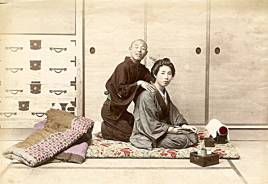« Blind shampoorer ». Tirage albuminé original aquarellé au Japon vers 1870-1890