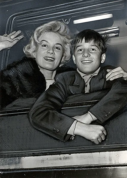 Jean-Pierre Léaud et sa mère, l’actrice Jacqueline Pierreux avant le départ pour le Festival de Cannes où sera présenté le film de François Truffaut « Les 400 coups », 1959.