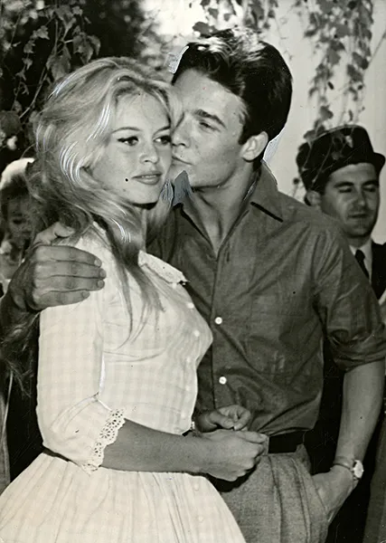 Brigitte Bardot et Jacques Charrier jeunes mariés à Louveciennes, le 18 juin 1959. Tirage argentique d’époque retouché à la gouache pour Publication du Parisien Libéré le 24/08/1960.