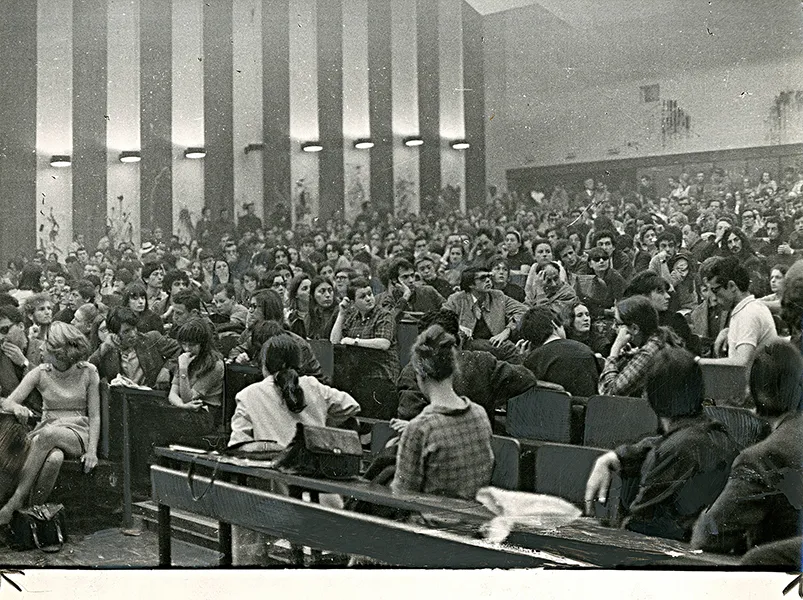 Débats publics à la faculté de Nanterre, le 20 mai 1968. Phot. Bureau Parisien. Tirage argentique retouché à la gouache publié le 29/05/1968