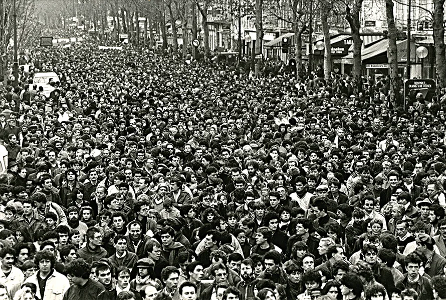 Manifestation silencieuse de 600.000 personnes depuis la Sorbonne à l’hôpital Cochin, après le décès de Malik Oussekine, Paris le 10/12/1986. Phot. Alain Noguès. Tirage argentique