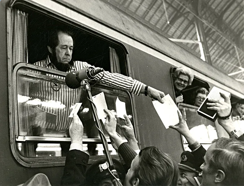 Alexandre Soljenitsyne (1918-2008) signe des autographes à la gare de Bâle en 1974″