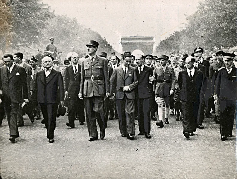 Libération de Paris : 26 août 1944, après avoir ranimé la flamme du Soldat inconnu sous l’Arc de Triomphe, le général de Gaulle descend les Champs Elysées.