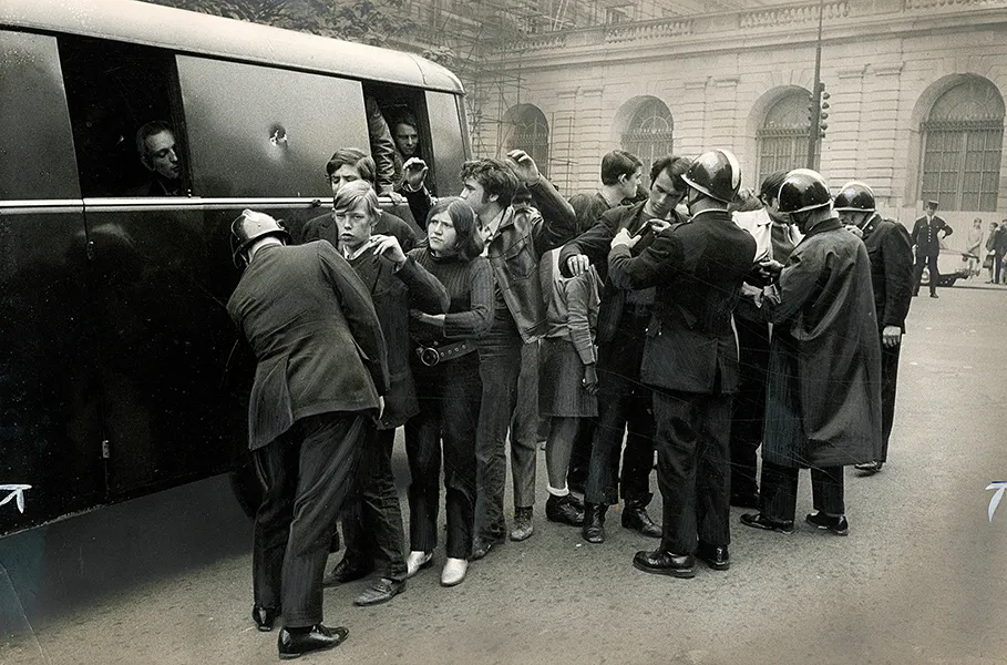 Paris 1968 Fouille des étudiants occupants du théâtre de l’Odéon( Paris) Tirage argentique retouché pour parution: Le Parisien Libéré 15/06/68