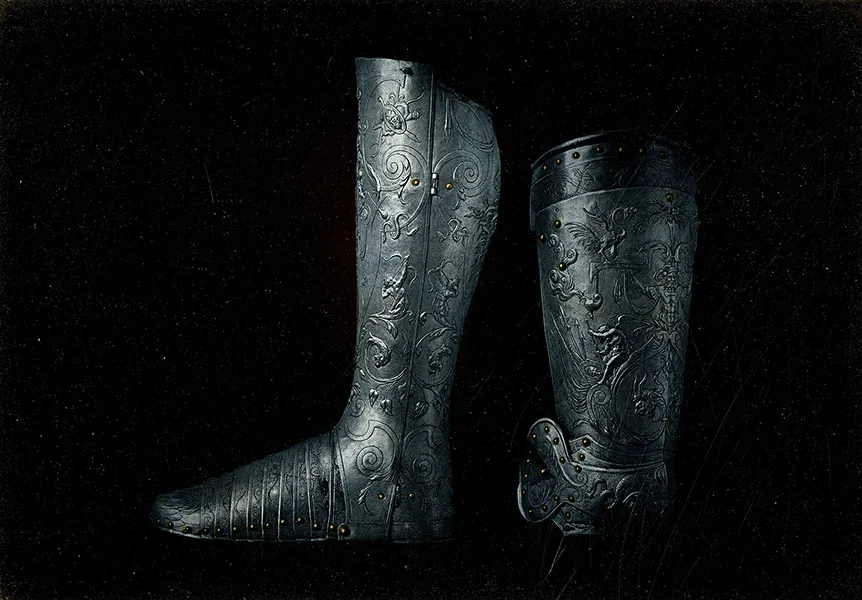 « Cuissard et jambière de l’armure du roi Henri II, Musée national du Louvre, galerie d’Apollon », 1876